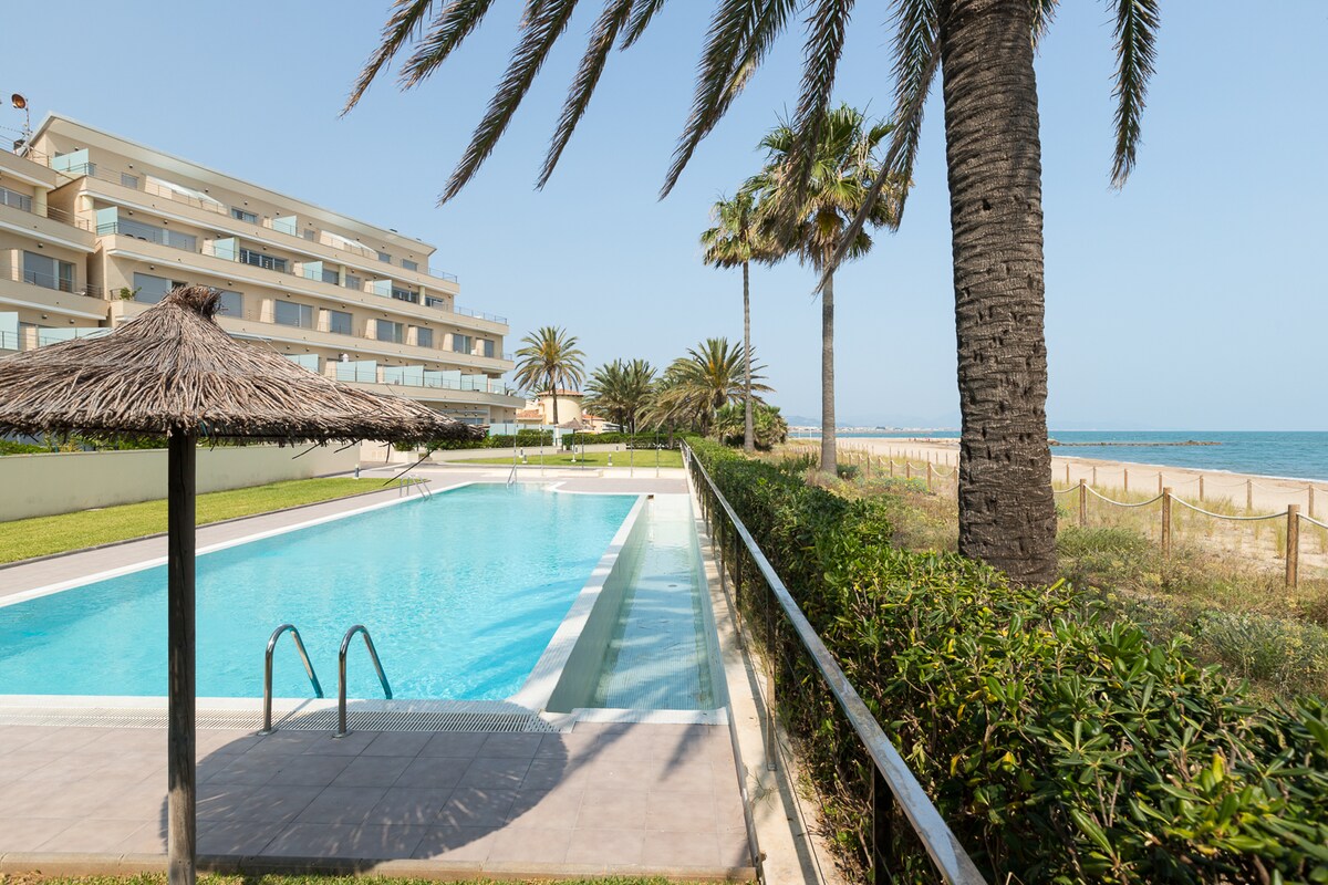Wake up with the sea at your feet! Luxury duplex on the first line, literally on the sand, with frontal sea views from every room and a spacious terrace. Ideal for 4 guests, it has 2 double bedrooms, 2 bathrooms, fully equipped kitchen, laundry room with washing machine, and air conditioning throughout. Located in a recently built complex with direct beach access, large swimming pool, and paddle court. ✔ First line ✔ Sea views ✔ Pool ✔ Direct beach access