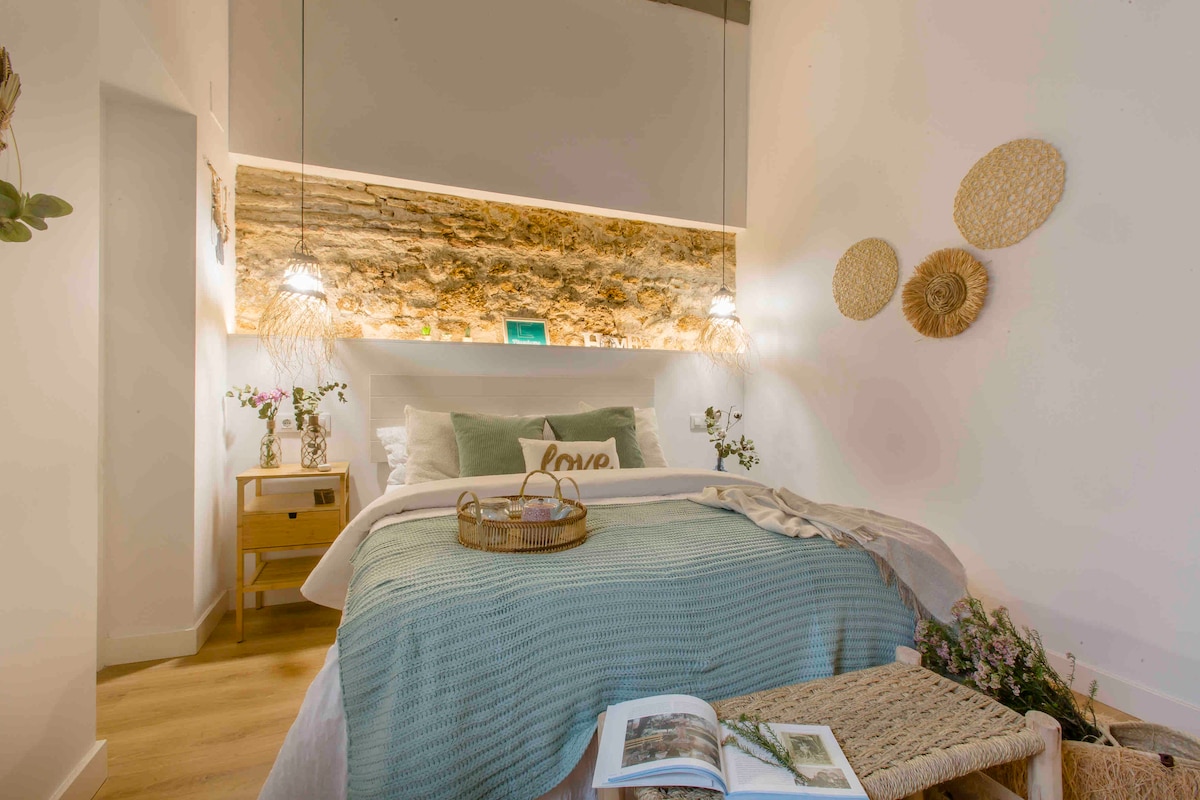 This magnificent two-bedrooms apartament is inside of a renovated building where traditional architectural elements had been conserved such as exposed wooden beams on its high ceiling and "ostionera" stones, typical from old city of Cádiz.