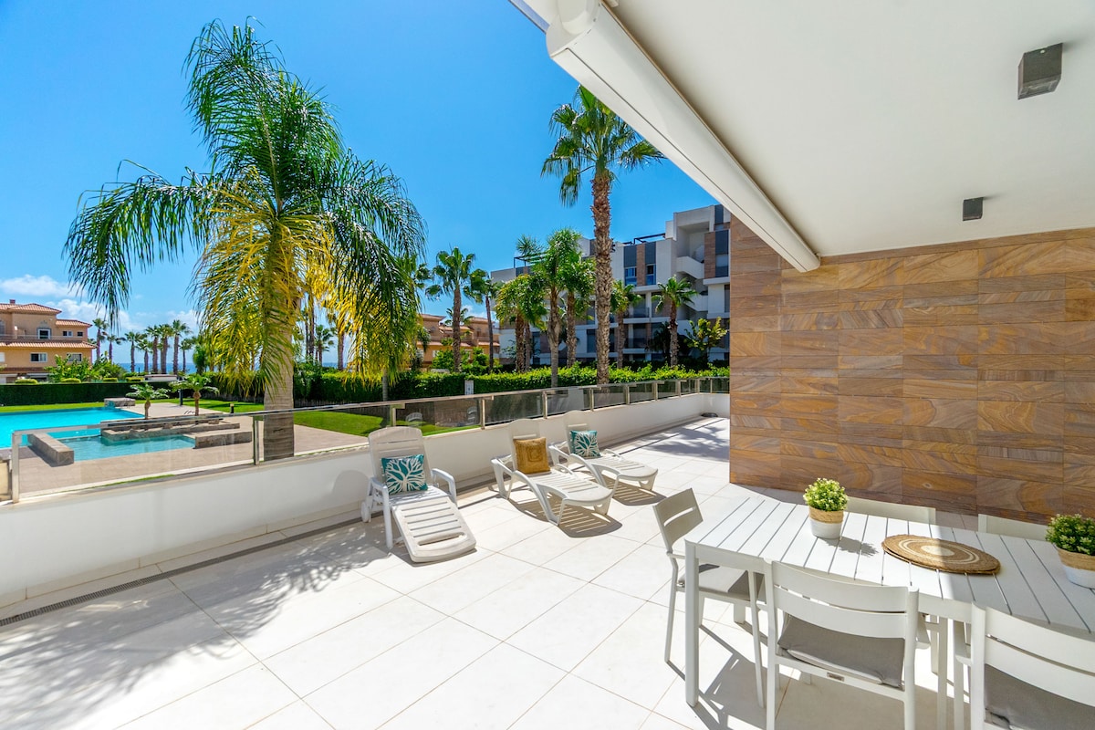 It's a 15-minute walk away. There are two bedrooms for guests. The living room has a sofa bed. The kitchen is fully equipped. Internet and television are available. There's a shower and barbecue on the upper terrace, which is private for the apartment only. Two swimming pools are on site. The largest shopping center, Zenia Boulevard, with its 150 shops and numerous restaurants, is just 300 meters from your vacation home.