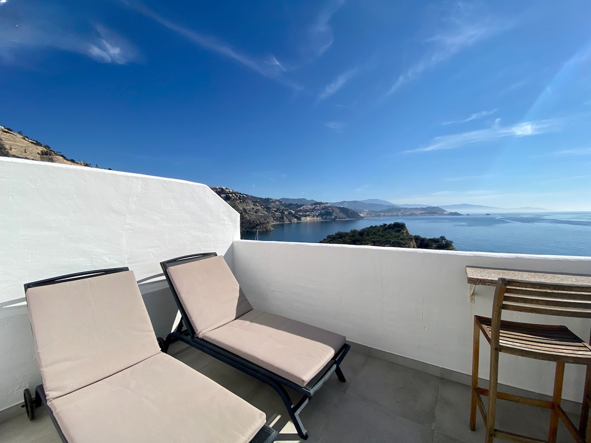 Spectacular beachfront apartment for 4 people with terrace and frontal sea views. Located on the second floor of a very quiet two-storey building in the center of La Herradura beach, 30 meters from the sand. Private terrace and rooftop terrace, both with unbeatable views of the bay. Two bedrooms, a complete bathroom and a half bathroom, both newly renovated, full kitchen, air conditioning, wifi internet, terrace furniture.
