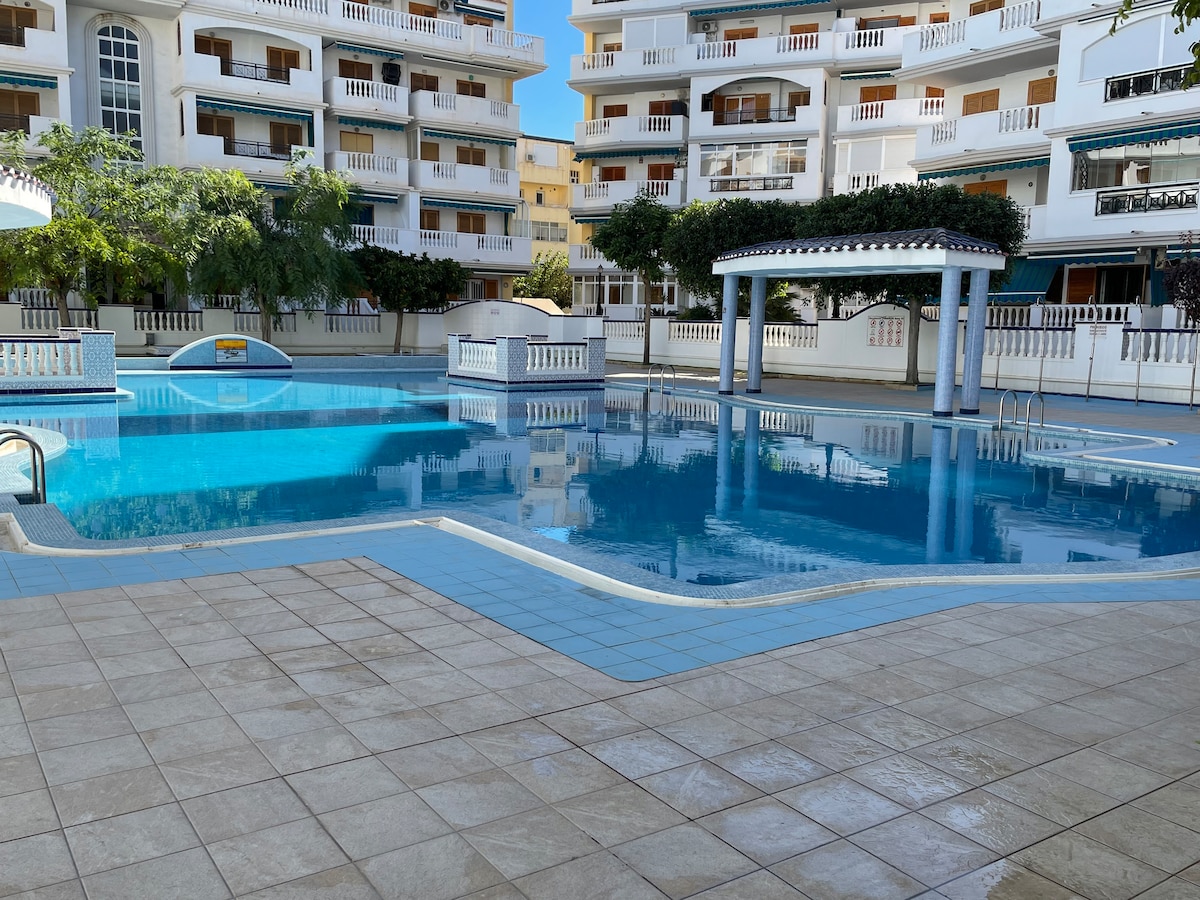 Take a break from the hustle and bustle of the city and relax in the beautiful Molino Blanco complex on the Mediterranean coast. The complex is located on the beach of La Mata,a large coastline where everyone will find a place to their liking. Promenade for walking,many cafes and restaurants. The complex has a swimming pool. The apartments have everything you need to spend a wonderful holiday. Bedroom with double bed,living room with sofa and large TV,balcony and huge terrace overlooking the sea