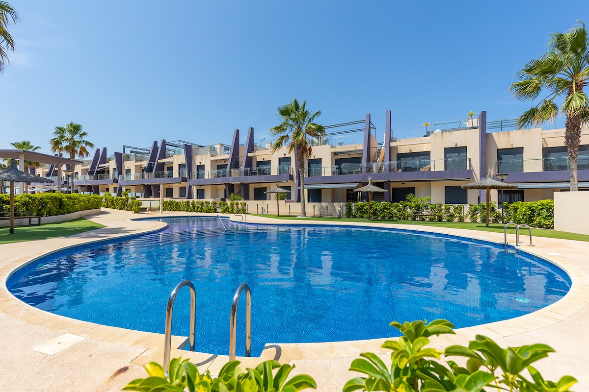 Experience coastal luxury in this stunning penthouse, just an 8-minute stroll from the iconic Mil Palmeras beach. Located in elegant Elisa Bay (Pilar de la Horadada), this 2017-built apartment offers 2 bedrooms, 2 bathrooms, a fully equipped kitchen, dishwasher, washing machine, TV and free WiFi. Enjoy Zara Home touches, air-conditioning throughout, two spacious terraces, five outdoor pools, a shopping area, restaurants and a secure gated community. Easy access from Murcia and Alicante airports.
