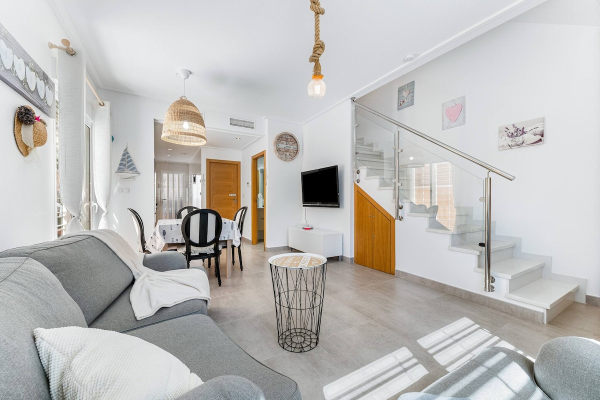 Recently renovated 3 bedroom home, close to the beach, in a quiet community with garden and pool. Fully equipped kitchen, front patio with sunscreen facing the communal garden. Air Conditioning in all the rooms, chimney for the winter. 5 min away to the beach. At the town center with more than 20 restaurants on walking distance, and 15 golf clubs on driving distance. Close to 3 monumental cities, 2 water amusement parks, thermal water spas, natural parks San Pedro and Calblanque...