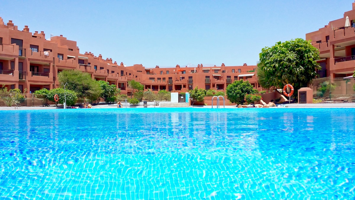 Apartamento a escasos metros de la playa con una maravillosa vista a la Montaña Roja de La Tejita. El apartamento cuenta con terraza, baño con bañera, cocina equipada (sin horno), y una habitación interior con cama de matrimonio. Además cuenta con piscina comunitaria y jardines muy bien cuidados. A unos metros se encuentra el centro comercial, tiene restauración, comercio y ocio. Y un extenso parque para pasear, jugar a fútbol o baloncesto. Lugar muy tranquilo para pasar unos días de descanso.