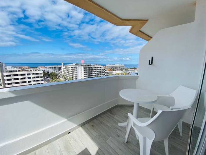 Fantastic new studio top floor in Las Americas centre. Completely renovated with modern furniture. Fully equipped kitchen with large fridge, oven, microvawe, ceramic-glass, oven, toaster, kettle and American coffee machine. Bathroom complete of shower, bidet, washing machine and window. Large wardrobe, king-size bed of 150x190, sofa, table 80/110x70 , TV led and WI-FI. Wonderful terrace double sea view: on the right Las Americas sea view and on the left Los Cristianos sea view!