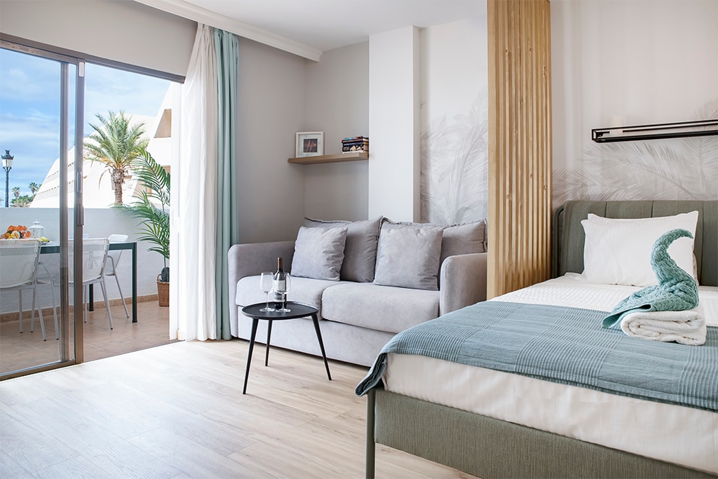 Spacious and modern studio located in favourite Tenerife spot: Playa de Las Americas in El Dorado complex. Access via lift to sixth floor, beautiful sea view from the balcony, walking distance to all night life amenities and 5 min to the beach. You will be in the centre of popular area so prepare for sea breeze walks and sunsets. Only suits couples but we would accommodate extra beds for 2 kids. Not suitable for 4 adults. We are family friendly apartment. There is tennis court in the complex.