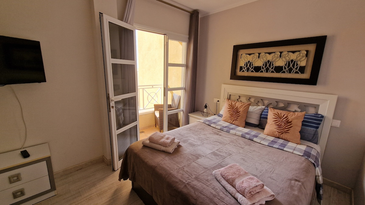 This studio apartment is situated in the most popular complex It is positioned in between two best beaches of Tenerife, on the border between Los Cristianos and Las Americas. The area is well known for its magic atmosphere especially in the evening, and the best shops in the town in the so called "Golden Mile Strip". The complex has a beautiful pool are and gardens. The entry to the complex is controlled, has direct access to the beach Las Vistas and suits both couples and families alike.