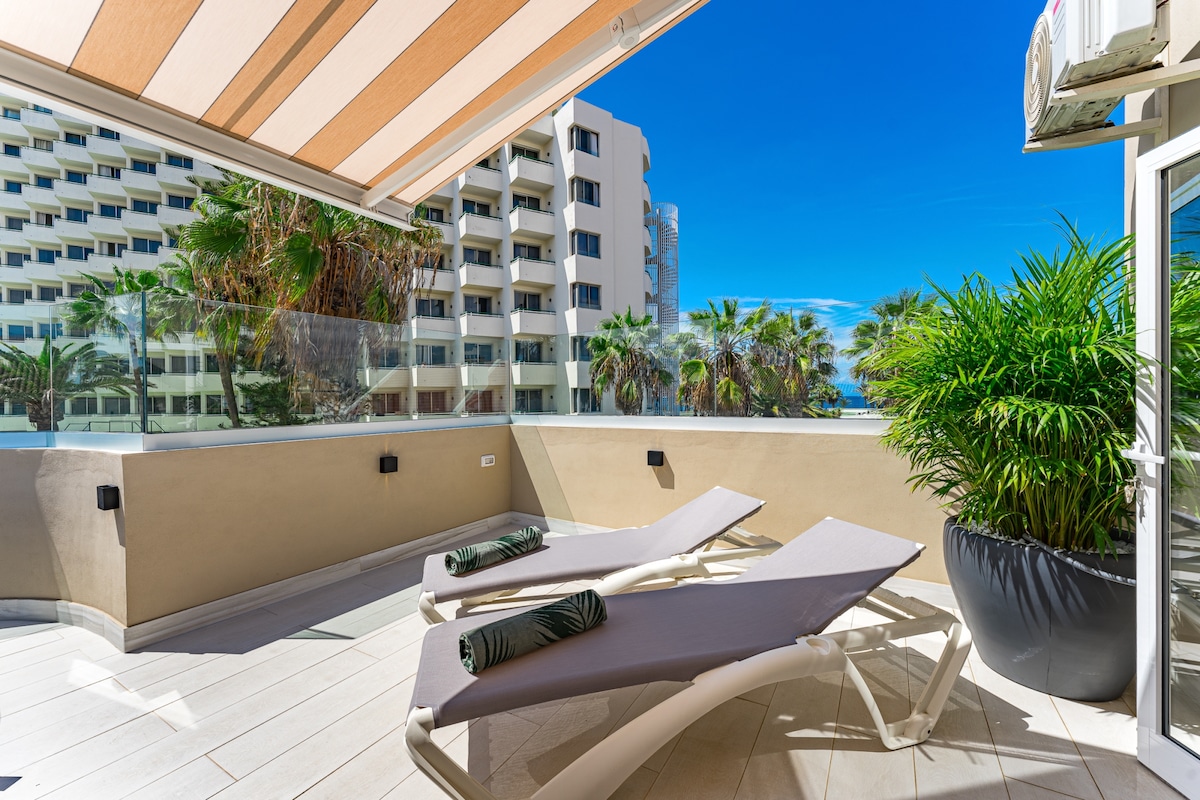 This charming modern apartment is carefully renovated to offer the best leisure and relaxation. It features a fully equipped open plan kitchen with a spacious bright dining and living room, which leads onto the large terrace with pool and garden view. The apartment has one comfortable bedroom with build-in wardrobe and a modern bathroom with shower. The complex offers a community pool exclusive for residents and a variety of excellent restaurants. The beach is only a 10 min easy walk.