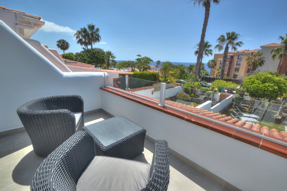 Modern villa for 4 guests, offering a lovely ocean view from the rooftop terrace. Just a 2-minute walk to the beach, with free wifi included. The complex boasts PARKING and a POOL, nestled in the vibrant heart of Las Americas, surrounded by restaurants and a shopping center. Additionally, it's only a 10-minute walk to Siam Park. Despite its central location, the villa is tucked away in a peaceful area, making it ideal for a relaxing holiday with your loved ones.