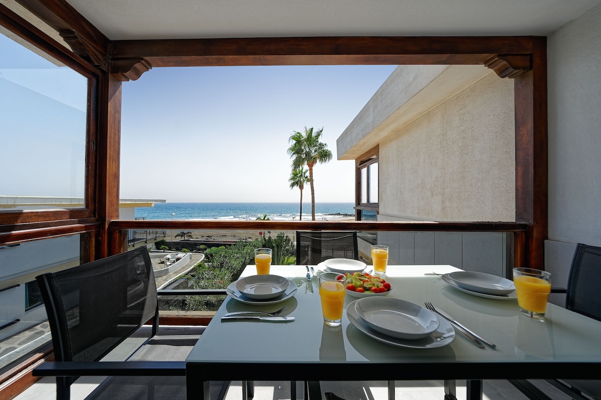 Apartment 100m2 with sea view and direct beach access in PLAYA DEL AGUILA. A corner of paradise with an exceptional climate all the year. Peaceful location that's ideal for families and romantic getaways. Come and recharge to the fullest! Large living room with full equipped kitchen and sofa bed for two people 1 bedroom suite with complete bathroom 1 double bedroom with 2 beds 1 bathroom with shower 2 terraces with ocean view All common areas as swimming pool and deck chairs have free access.