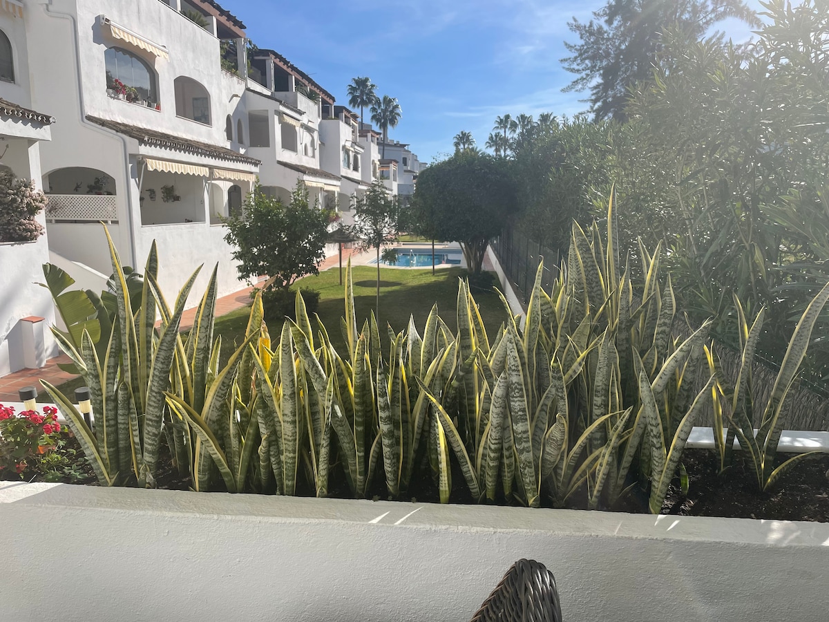 Magnífico apartamento a un paso de la mejor playa de Marbella en la zona de Elviria, Golden Beach. Recientemente reformado y amueblado ,con dos preciosas terrazas que dan al jardin y a la piscina. acceso directo del apartamento al jardin que hace sentirte en un pequeño chalet. Dispone de un precioso dormitorio exterior con terraza muy luminoso y con baño en suite, así como otro amplio dormitorio y un precioso salón con terraza con salida directa al jardín. Te sentirás como en tu casa.