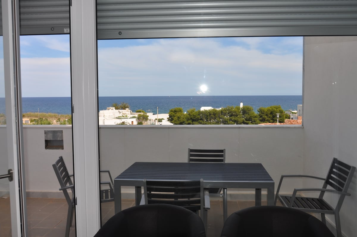 Apartamento de 100m2 con terraza y vistas al mar. 3 habitaciones (camas para 7 personas), 2 baños completos. Preciosas vistas al mar. Urbanización privada con piscina y padel. A 100m de la playa. La piscina está abierta todo el año. La casa dispone de WIFI (fibra óptica), de mesa de trabajo y silla de oficina (previa solicitud), perfecto si necesitáis trabajar a distancia.