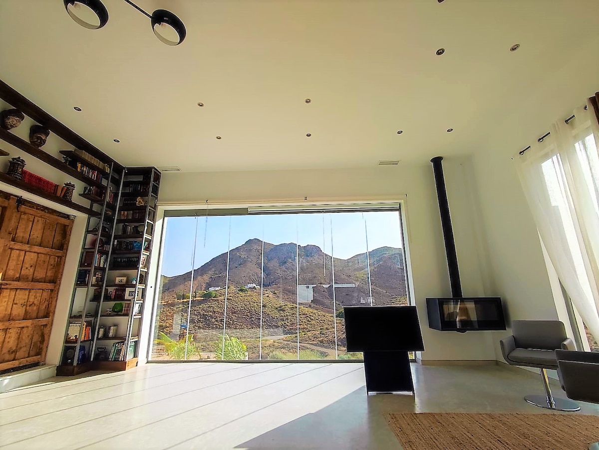 Casa muy especial, por su ubicación, diseño y decoración. Situada en la localidad de Las Negras, a 10 minutos andado del pueblo y de la playa. Linda con el parque natural en un enclave totalmente tranquilo donde podrás disfrutar de unos maravillosos cielos de estrellas. La piscina y zona de estar exterior son totalmente íntimas orientadas hacia el Parque Natural. Dispone de 3 dormitorios, 3 baños, 2 salones, proyector de cine, elementos para hacer deporte, cocina exterior, 2 chimeneas etc..