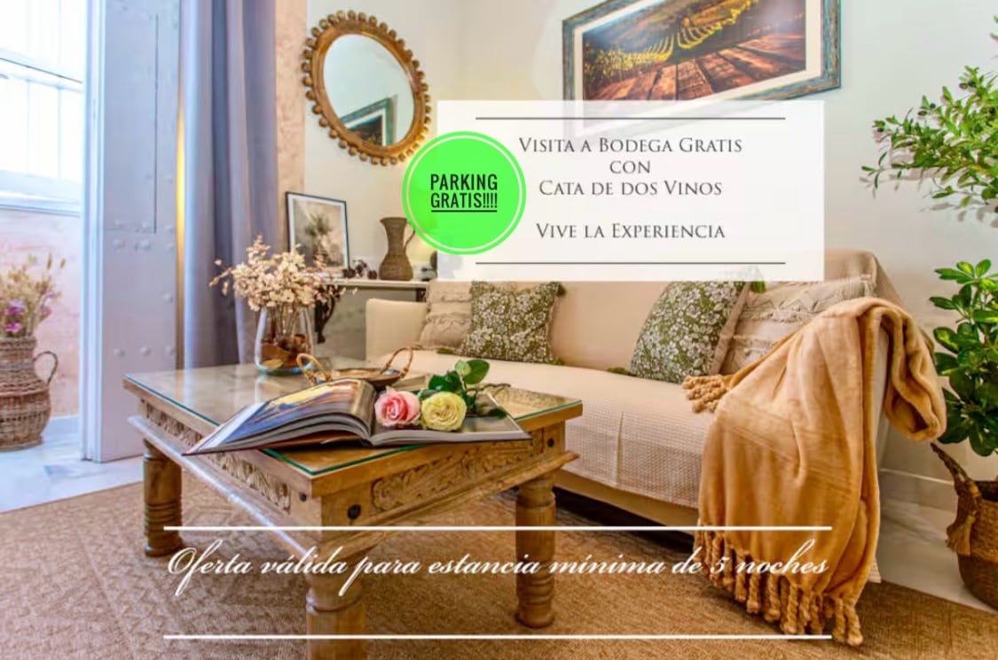 Apartamento para adultos y niños mayores de 10 años. No fumadores. Aparcamiento incluido en el precio de la reserva. El Loft se ubica en una bodega jerezana rehabilitada del siglo XVIII. Es un espacio diáfano bellamente decorado y completamente equipado. Está situado en primera planta con ascesor y cuenta con una terraza amueblada de 20 m2 bajo los soportales del patio en planta baja. Es un lugar muy tranquilo para desconectar y disfrutar de la paz y el silencio en un edificio histórico.
