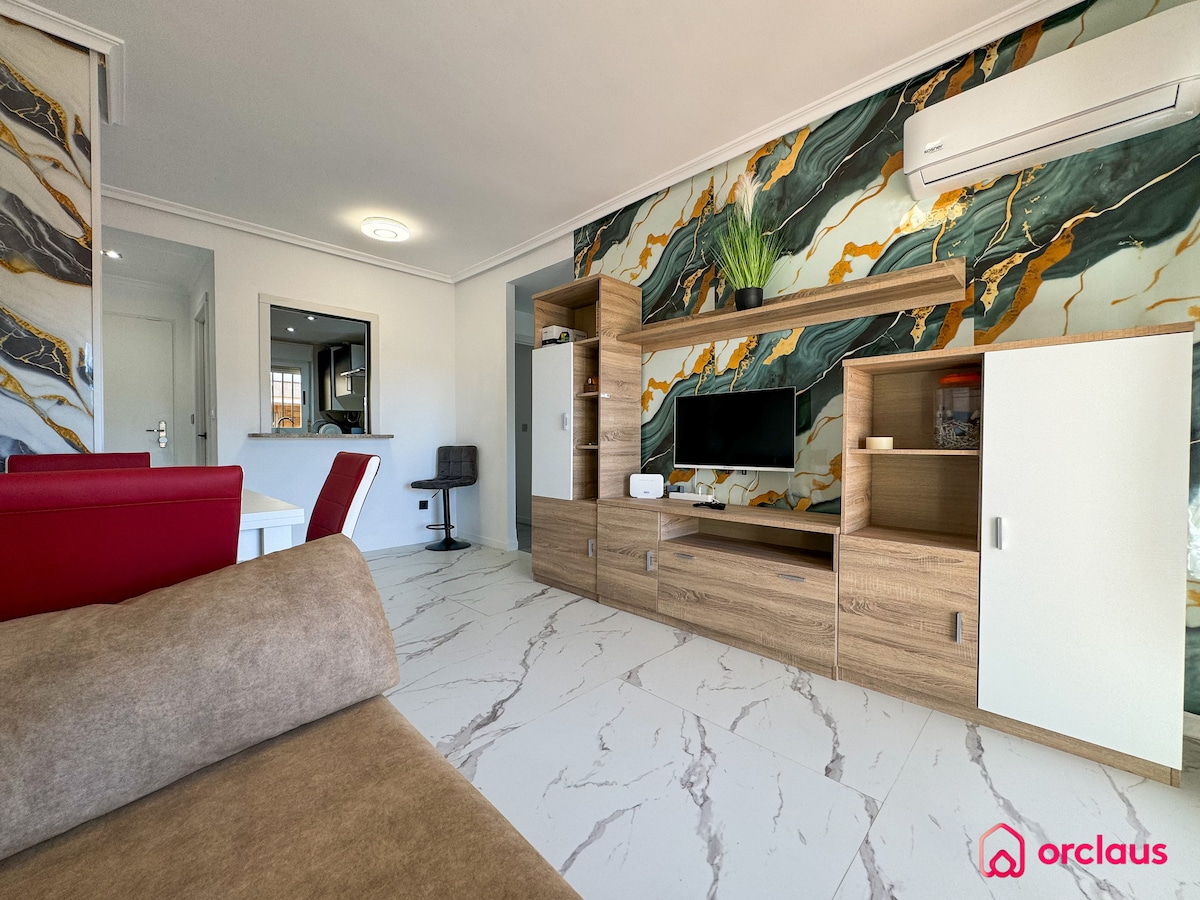 Marina Dor Disponible estupendo apartamento en una de las mejores urbanizaciones Playa Dorada. Disfruta de unas vacaciones tranquilas en 1ª linea de playa pero al lado de todo. Capacidad hasta 6 personas. Equipado con todo para que solo te preocupes de venir y disfrutar Aire acondicionado Terraza con vistas al Mar 2 Baños bañera hidromasaje y plato de ducha plaza de parking subterráneo Piscina Cerca de supermercados 2 dormitorios salon con sofá cama wifi y Smart TV