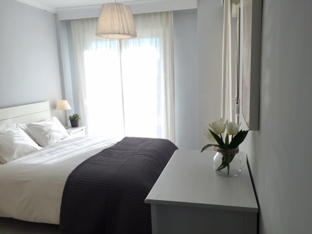 Spacious 1BD with large terrace. Use of pool (seasonal opening), tennis court, gardens and direct access to the beach. Air con / heat, smart TV, blue-tooth music speaker and fibre optic WIFI. 5 minutes walk from the center of Torremolinos and the train station for Malaga Airport.