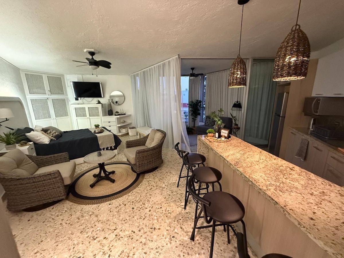 Amplio y cómodo departamento en planta baja con acceso directo a la alberca. Cuenta con 2 habitaciones con cama king, A/C y baño privado cada una. Cocina equipada con isla, Smart TV, sala con ventilador y Wi‑Fi. Ideal para descansar. A 50 m de la playa y 100 m del malecón. Solo adultos.