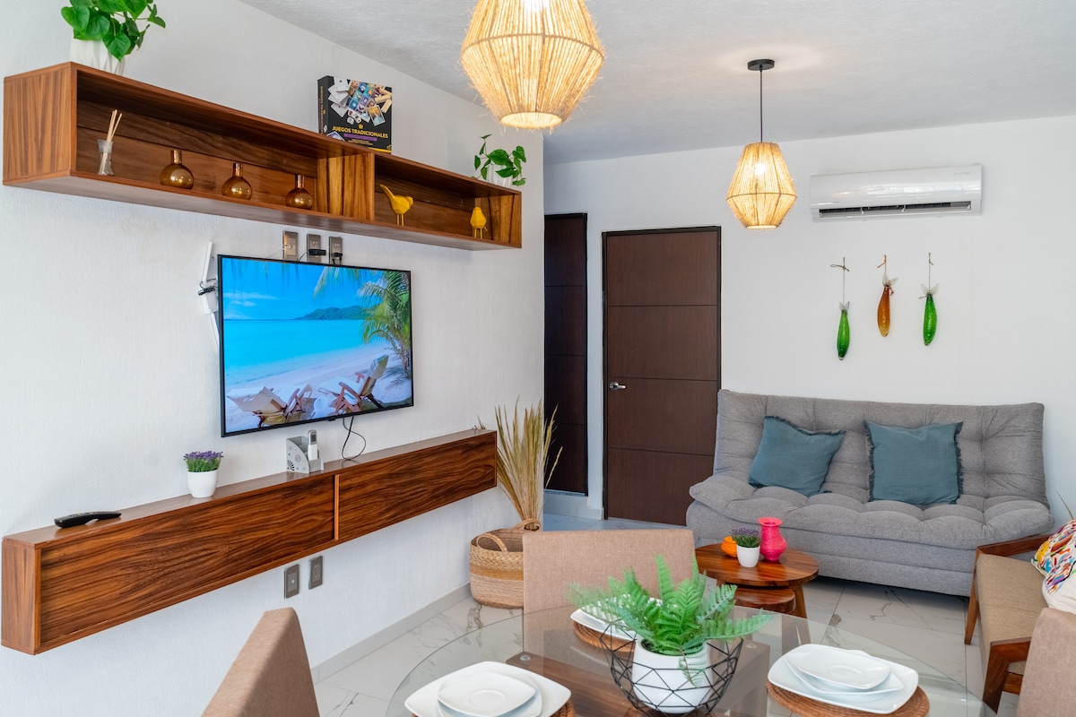 El departamento es muy acogedor y tranquilo, ideal para salir de la rutina, tomar un descanso y disfrutar de la playa. Dentro del condominio podrás encontrar todo lo que necesitas para tu estancia, hay varios restaurantes para cenar, el restaurante de la alberca para desayunar y comer; también hay tiendas de conveniencia por si llegaran a necesitar algo. en el departamento encontrarán sillas y sombrilla para disfrutar de la acogedora playa de puerto las hadas