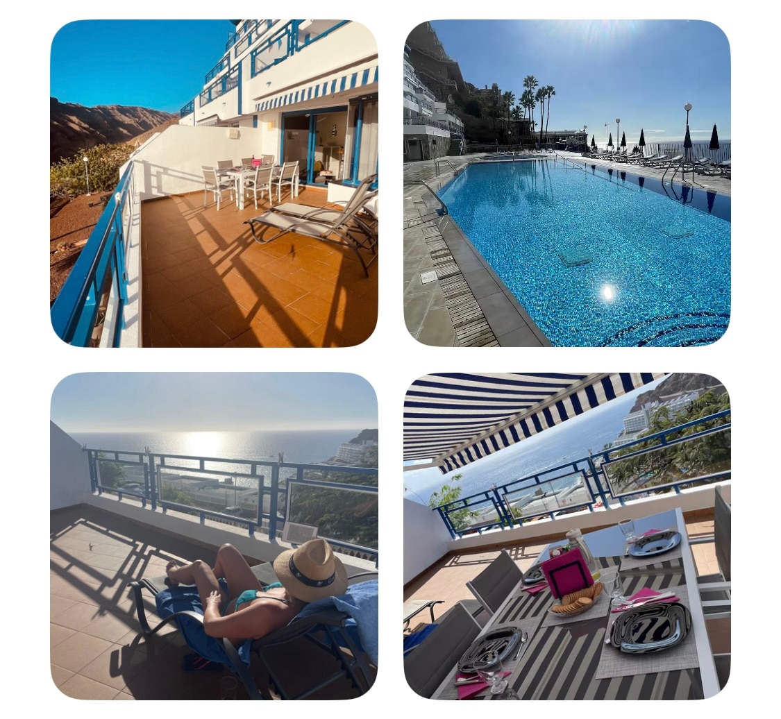 TWO bedroom large apartment in Puerto de MOGAN, with Heated ROOF-TOP POOL. We are close to the pretty harbour, golden sandy beach and great restaurants. Air Con. Large secluded balcony equipped with sun loungers and dining table. Flat screen TV, Satellite, UK channels, Netflix. Video intercom. Full size kitchen facilities. New fitted bathroom. Our Fabulous roof-top pool provides plenty of sunbeds and parasols. Tourist Licence Number: ESFCTU000035021000293083000000000000VV-35-1-00043634