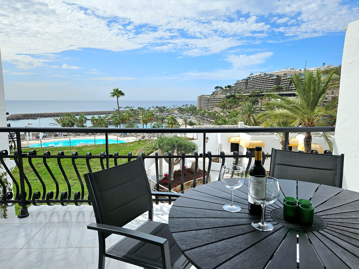Acogedor y moderno apartamento en Patalavaca, al suroeste de Gran Canaria, con impresionantes vistas panorámicas sobre el mar y la montaña, a 10 minutos a pie de la pequeña playa de Patalavaca, una playa muy protegida del viento en invierno. Un lugar ideal para el descanso. Amplia piscina y solarium suspendida encima del mar. AIRE ACONDICIONADO INTERNET FIBRA ÓPTICA Smart TV+canales internacionales