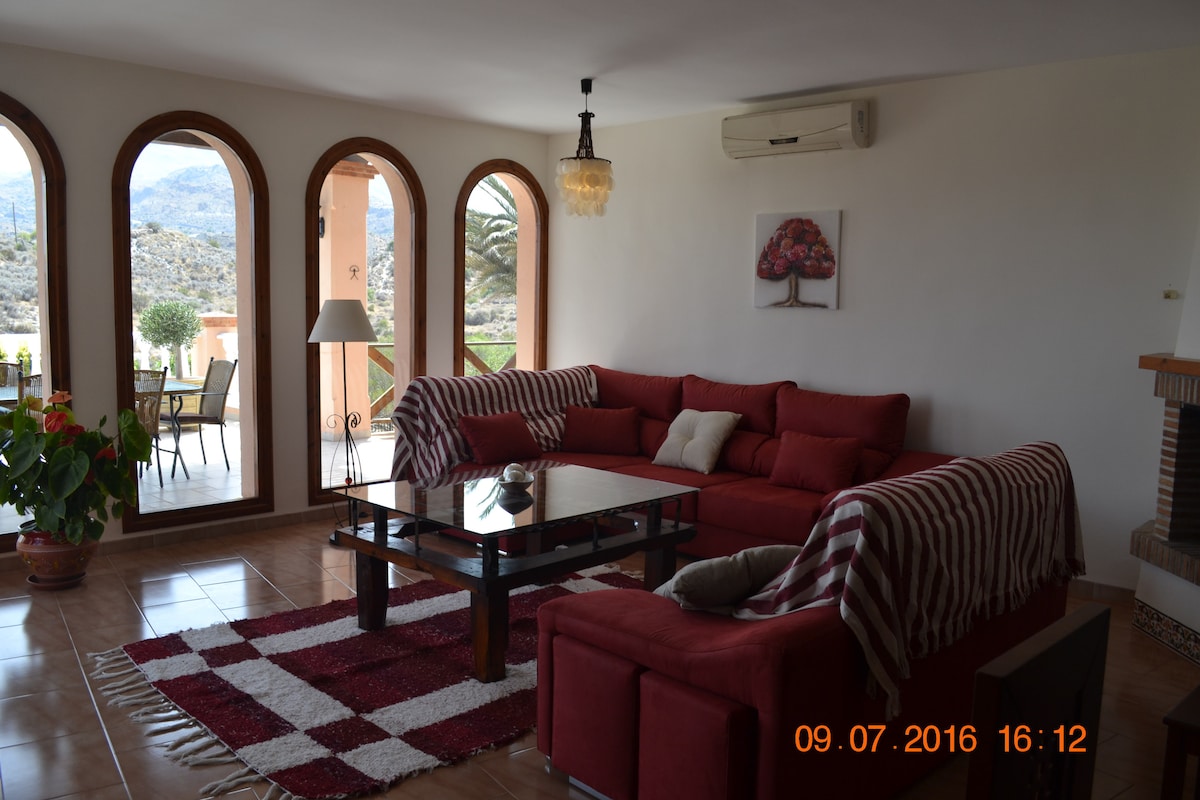 A modern house located within the extensive grounds of the hosts property, Which has 2 private terraces with mountain views,pool,sunbathing area with luxury furniture ,outdoor kitchen,honesty bar,pool table,darts board and gardens for your enjoyment. Within walking distance there are 3 bars/restaurants. The traditional town of Antas with shops/bars/restaurants is 3 minutes by car. It is 15 minutes drive to numerous beaches, golf courses, waterparks and other attractions