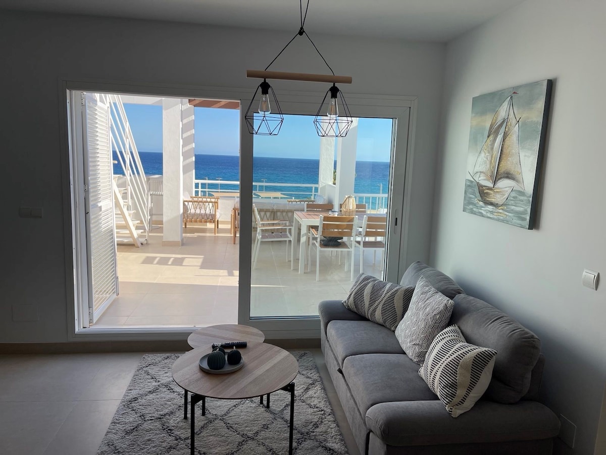 The perfect place to relax and enjoy. The apartment is located on top of a hill and a 5-10 min walk from te beach and the boulevard with all restaurants and bars. The air bnb has a huge terrace (70m2) with a roofed dining area, lounge and a barbecue. The views are spectacular. You will live between the mountains with a fantastic pool- and seaview. Inside we have all equipment and service you need. Mojácar and it's surroundings has a lot to offer.