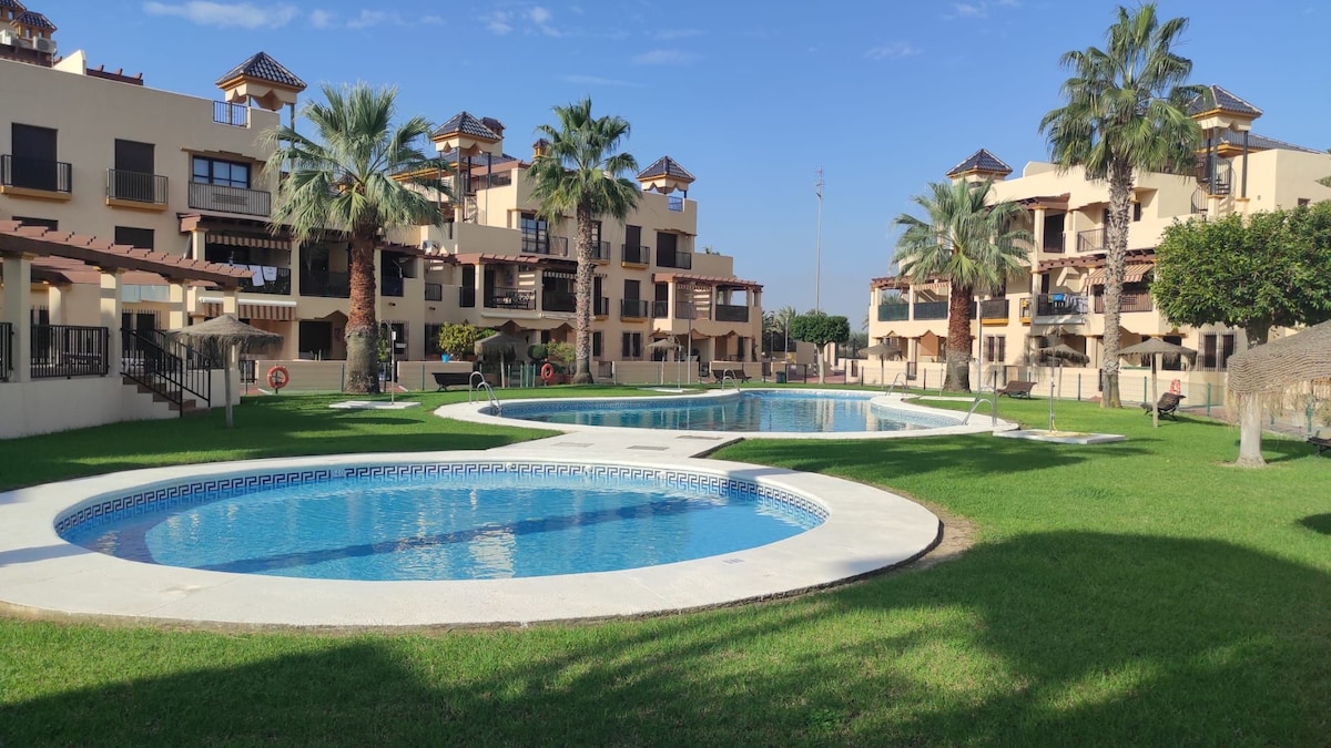 Apartamento bajo con porche en primera línea de playa en Puerto Rey, Almeria. Dos habitaciones, salón comedor, cocina con barra, baño, lavadero y trastero. Aire acondicionado, sofá cama, wifi, smart TV de 55" (Netflix y Amaon Prime) lavadora y secadora. La cocina está equipada con microondas, lavavajillas y menaje completo. La habitación principal consta de cama de matrimonio de 160 y la secundaria de dos camas de 90, ambas con armarios. Parcela de parking privado exterior. Piscina comunitaria.