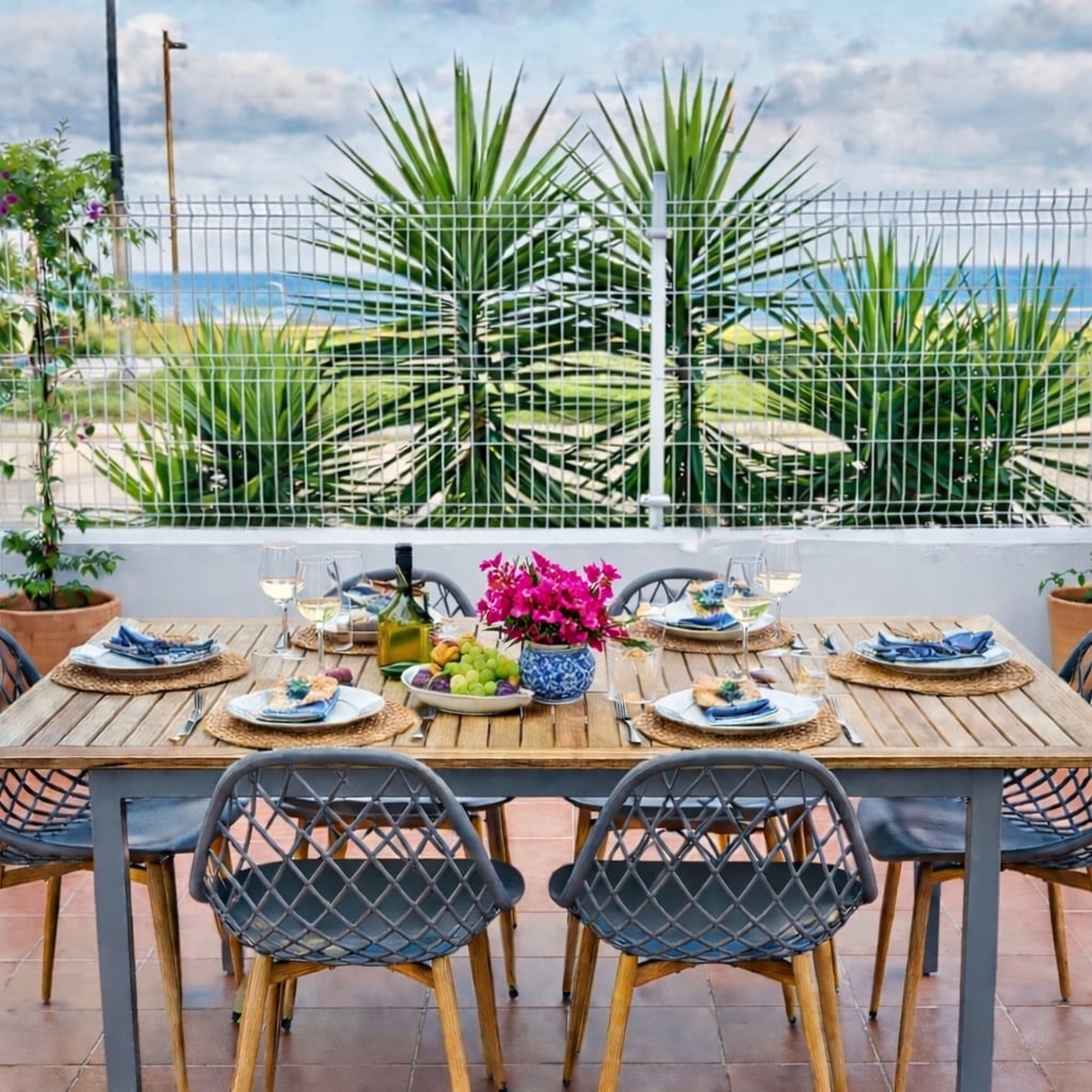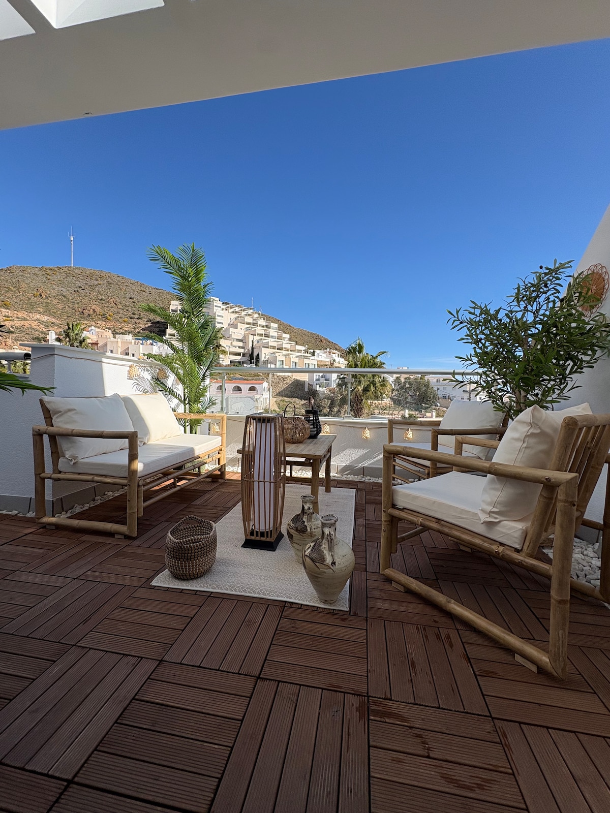 Amazing new apartment with 80 m2 modern living area and a huge 45m2 fantastic terrasse with a nice lounge set, dining area and sunbeds. The apartment is placed 100 m from the best beach in Mojacar and is fully equipped with modern furnitures and WIFI, television, fast speed internet and centrally controlled aircon. It is located in the more quiet south end of Mojacar with beach, restaurants and bars within walking distance