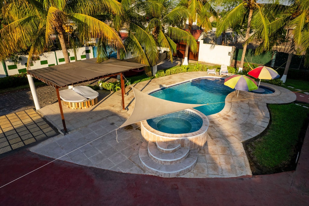 Lindo y espacioso chalet en Monterrico, con todas las comodidades para disfrutar inolvidables días de playa con amigos y/o familia. Cuenta con parrilla, piscina, jacuzzi, hamacas, jardín y una terraza donde podrás disfrutar de hermosos atardeceres. La propiedad consta de 4 amplias habitaciones c/aire acondicionado y baño incorporado en cada una. Capacidad para 15 personas, cocina totalmente equipada y con utensilios a tu disposición, estacionamiento para 4 vehículos y garita de seguridad.