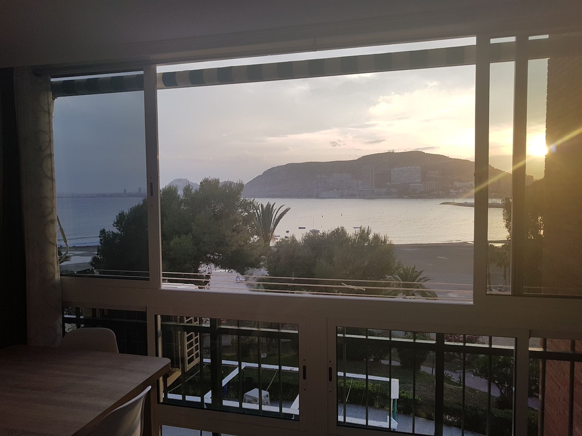 Precioso apartamento en primera línea de playa (salida directa al mar) con inmejorables vistas al mediterráneo. Ideal para parejas y familias con hijos. Prohibido fiestas y ruidos.Disponible para Largas Estancias. Consúltenos. Zona conectada con transporte público: TRAM y Autobuses con el centro ciudad. Todos los servicios: Restaurantes, Supermercados, Farmacia. Cuenta con una terraza frontal e impresionantes vistas al Castillo de Santa Bárbara; donde podrá relajarse observando las olas del Mar