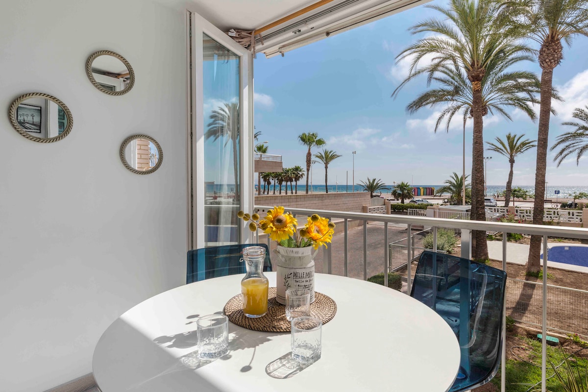 Magnifico apartamento reformado moderno y confortable en primera línea de playa, inmejorables vistas, en la mejor zona de la playa con aire acondicionado y calefacción en urbanización con piscina y pádel, zona infantil, plaza de parking en el propio edificio. Paseo peatonal en la puerta sin coches ni tranvía, rodeado de restaurantes, farmacia en la misma manzana, supermercados y zona comercial. Nº registro VT-453714-A categoría E.