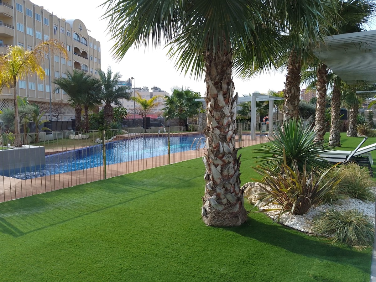 New beachfront apartment: Swim, train, relax, and enjoy the SUN! This newly built apartment offers a quiet, luxurious stay with the comforts of home, perfect for digital nomads or couples. The master bedroom has a 160x210 cm bed, and there’s a sofa bed for children. Relax on the balcony with ocean views. The complex features a gym, infinity pool, garden, social club, and direct beach access. Conveniently located near restaurants, just 100m from the beach, and close to Fabraquer tram stop.