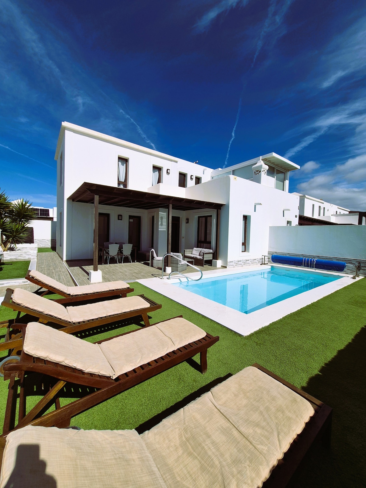 PISCINA CLIMATIZADA. Villa de Gran Lujo GL 5* de reciente construcción año 2017, situada en la soleada localidad de Playa Blanca. Posee una cap. max. para 7 personas y sus principales distintivos son una villa luminosa muy espaciosa con terminaciones y materiales de máxima calidad. Está perfectamente equipada con la finalidad de que pasen unas vacaciones inolvidables y regresen nuevamente a esta isla mágica y de encanto. Cuenta con WIFI,TV CURVE 50" SMART- TV ,SATELITE 350 CANALES, TABLET.