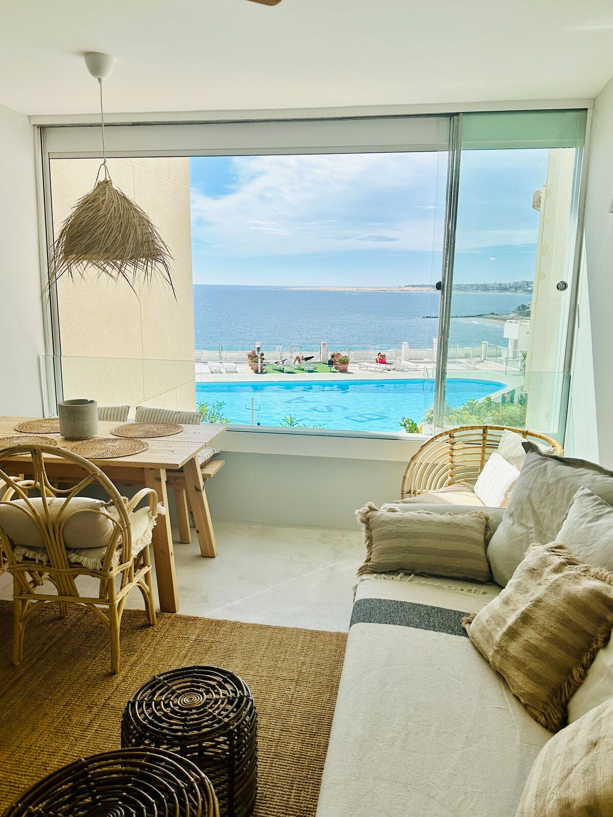 Cosy apartment located on the beachfront. Perfect for quiet vacations. Enjoy the sea view from the balcony and the closeness of the beach. The sand is a few steps from the apartment and the complex has a private access to the beach. The ideal place to escape from the routine and stress, enjoying one of the best sunrises of the island. The apartment is fully equipped so you will have everything you need for your stay. The boho-chic decorated living room has a 65-inch TV and a bed couch. WifiTOP