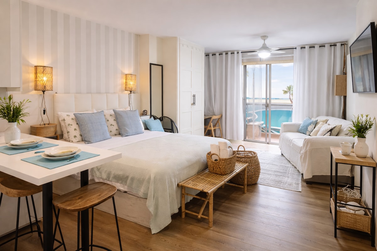 Stay right on Marbella’s 1st line beach in this 40 m² studio with side sea view terrace, king bed + sofa bed, A/C, ceiling fan, Smart TV & high-speed WiFi, & private working place. Enjoy 2 pools — sea-level & rooftop with panoramic views. Fully equipped kitchen, beach amenities, and SUP board available. Steps from cafés, shops & attractions. High chair, baby cot, games & books on request. No car needed. Perfect for couples, small families, or friends!
