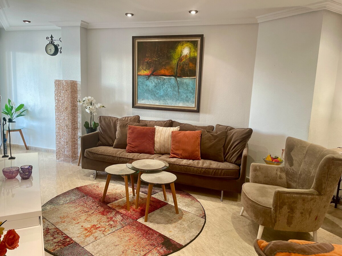 Sunny apartment on the Costa Blanca, facing the sea, ideal for short holidays or full seasons. Playa de los Náufragos and Playa del Acequion 1 min walk. Fully furnished, it has what you need to not worry about anything. We have a crib and high chair. Doors and toilet prepared for the disabled. There is free parking. Pharmacy services, supermarkets, restaurants, bus stop, taxi in the same building 😀 15 minutes walk from the center and the fair! You don't need a car!!