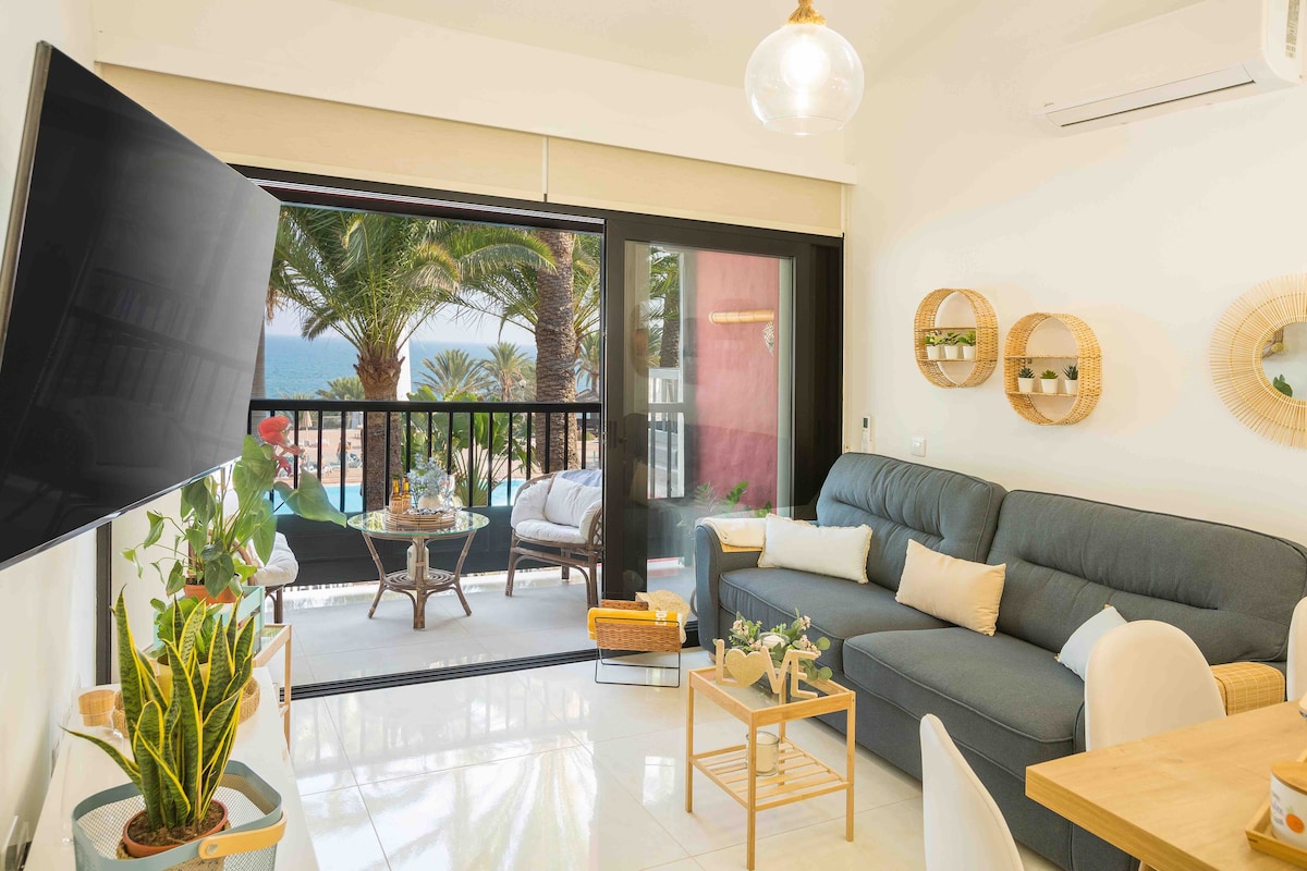 Cosy apartment located on the beachfront. Perfect for quiet vacations. Enjoy the sea view from the balcony and the closeness of the beach. The sand is a few steps from the apartment and the complex has a private access to the beach. The ideal place to escape from the routine and stress, enjoying one of the best sunrises of the island. The apartment is fully equipped so you will have everything you need for your stay. The boho-chic decorated living room has a 65-inch TV and a bed couch. WifiTOP