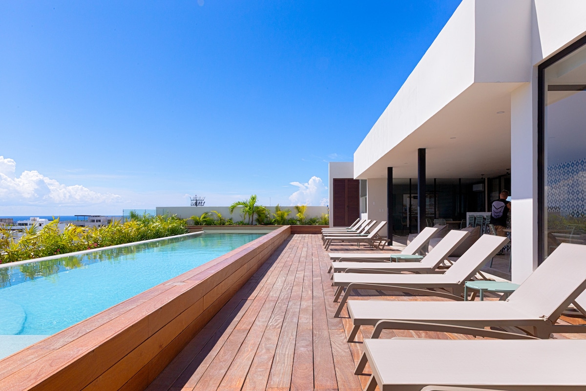 Wake up to a Priceless Caribbean oceanfront view. Enjoy your own plunge pool in terrace. Head downstairs for beach access. Walk everywhere…distance to the 5th ave and many other shopping & dining options. Gourmet restaurant in building & rooftop infinity pool. Gym Este lugar tiene una ubicación estratégica: ¡será muy fácil planear tu visita! estrategicamente ubicado frente al mar con los mas famosos clubs de playa justo al lado, area vibrante y a cinco minutos caminando de la quinta ave