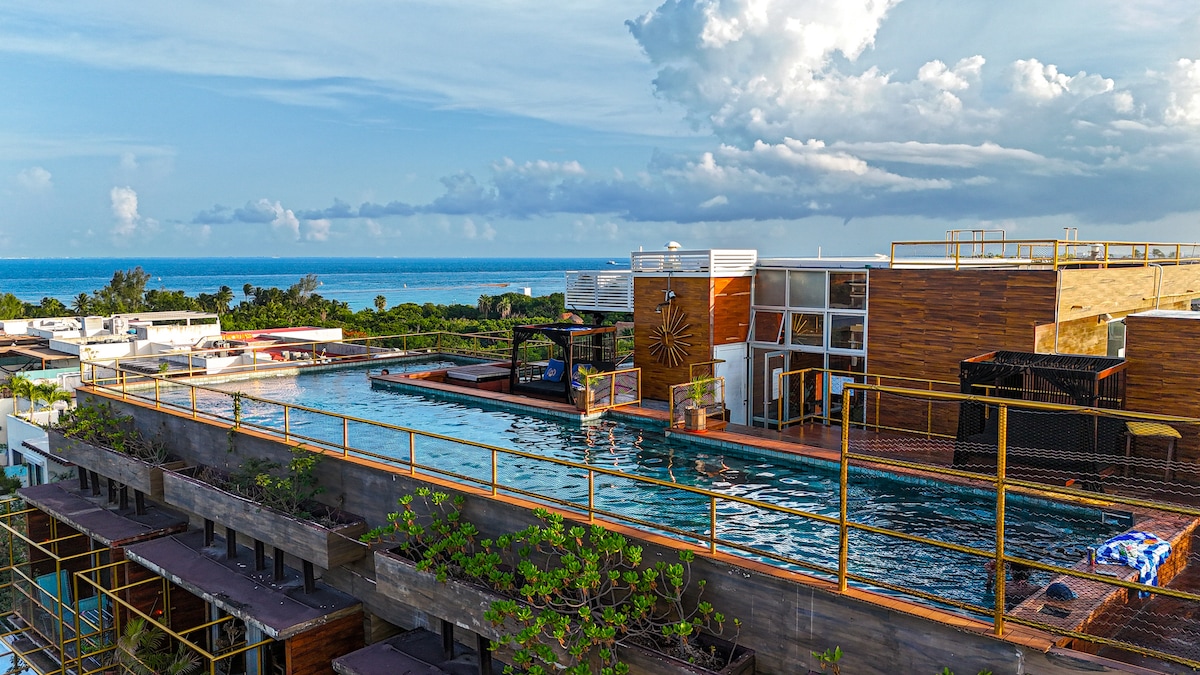 Professionally-designed modern and comfortable suite with a location second to none. The beautiful white sands and crystal clear warm waters of the Riviera Maya are steps away. The famous 5th Ave. Shopping District is one block away with everything you would ever need. Bikes are included so you can enjoy a short ride to many beaches. After a day of adventure, enjoy your luxury suite, private balcony with city and ocean views or enjoy the rooftop pool with panoramic 360 degree views.