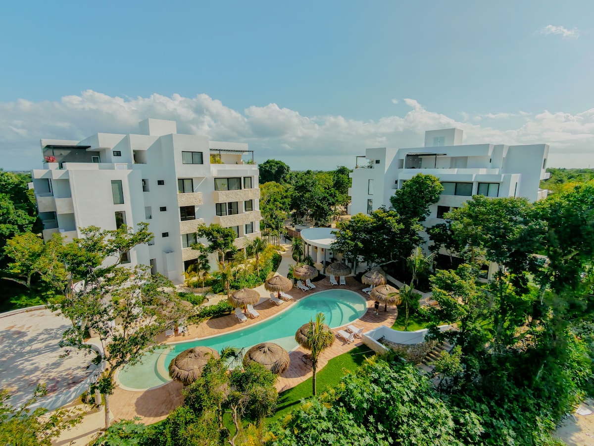 GROUND floor/ LOFT apartment offers 2 bedrooms with 2 king beds. & sofa couch for 2 people. - Comfortable 2-bedroom, 2-bathroom apartment with AC. - Private terrace overlooking the pool. - Huge 150m pool with built-in bar, HOT Tub and hammocks. - Gym with weight training, cardio, yoga, hammam, and sauna. - Rooftop Pool reserved for adults with exclusive relaxation area and two pools. - Playa del Carmen's beautiful beaches just a 10-minute walk away. -Private Reef Beach access