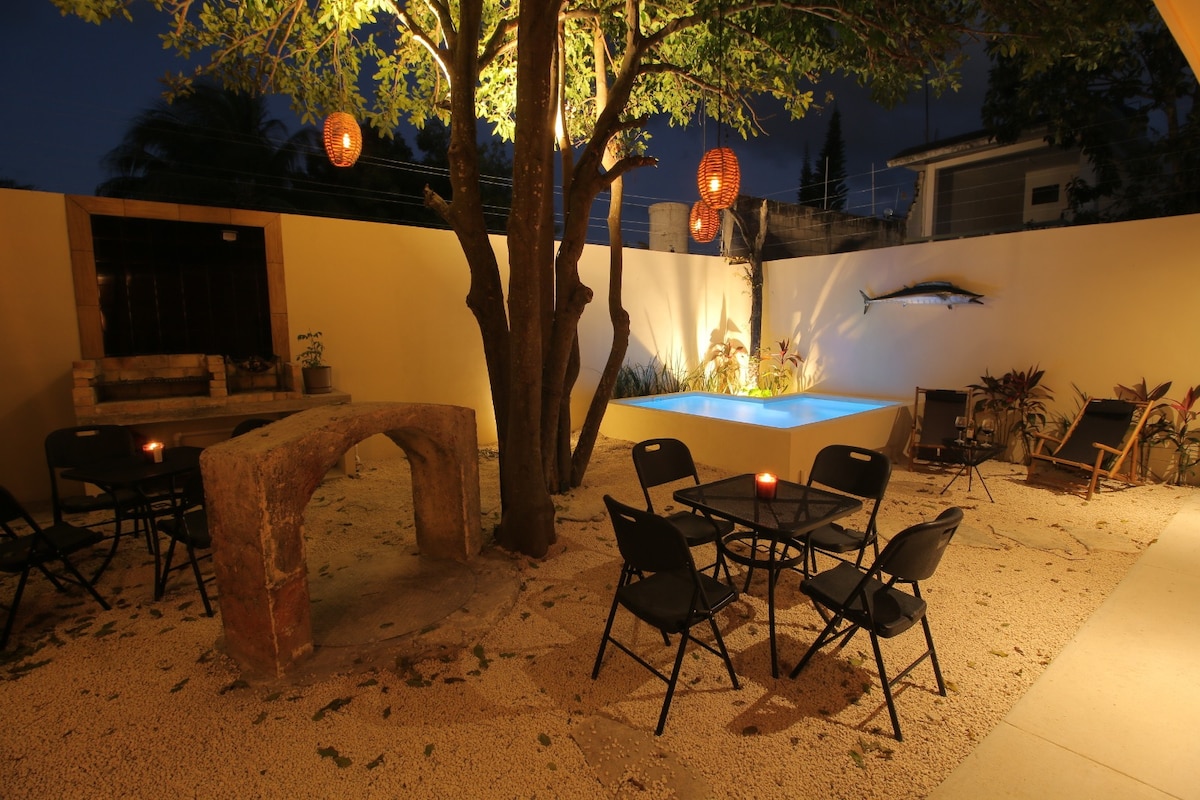 THE JUNGALOW! Not fancy, just FUN! Jungle Family Camp is the best place to spend an adventurous holiday without breaking the budget. A cozy camp-like stay in our small studio bungalow. King size bed for Mom & Dad, plus pull out bed for kids. Cook your own meals in your private kitchen or outside on the BBQ. Sleep soundly all night and wake to the sound of little chirping birds. Spend your day exploring. then come back to friendly faces and comfy spaces at CAMP AKUMAL! A hosted experience!
