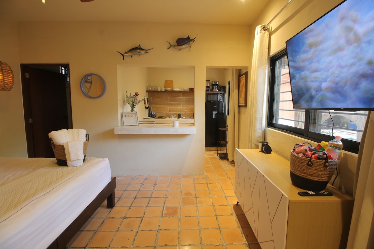 Independent studio with a touch of good taste, attached to Casa Machetes, have a nice common terrace to enjoy the sunsets and take a refreshing dip in the pool. The Tobala Studio has a king size bed, spacious closets, a kitchenette equipped with a refrigerator, grill, microwave, utensils, and a coffee maker. Add air conditioning, fan and a smart TV. It has a small balcony with ferns for the taste of smokers. Come and live the experience of being at Casa Machetes.