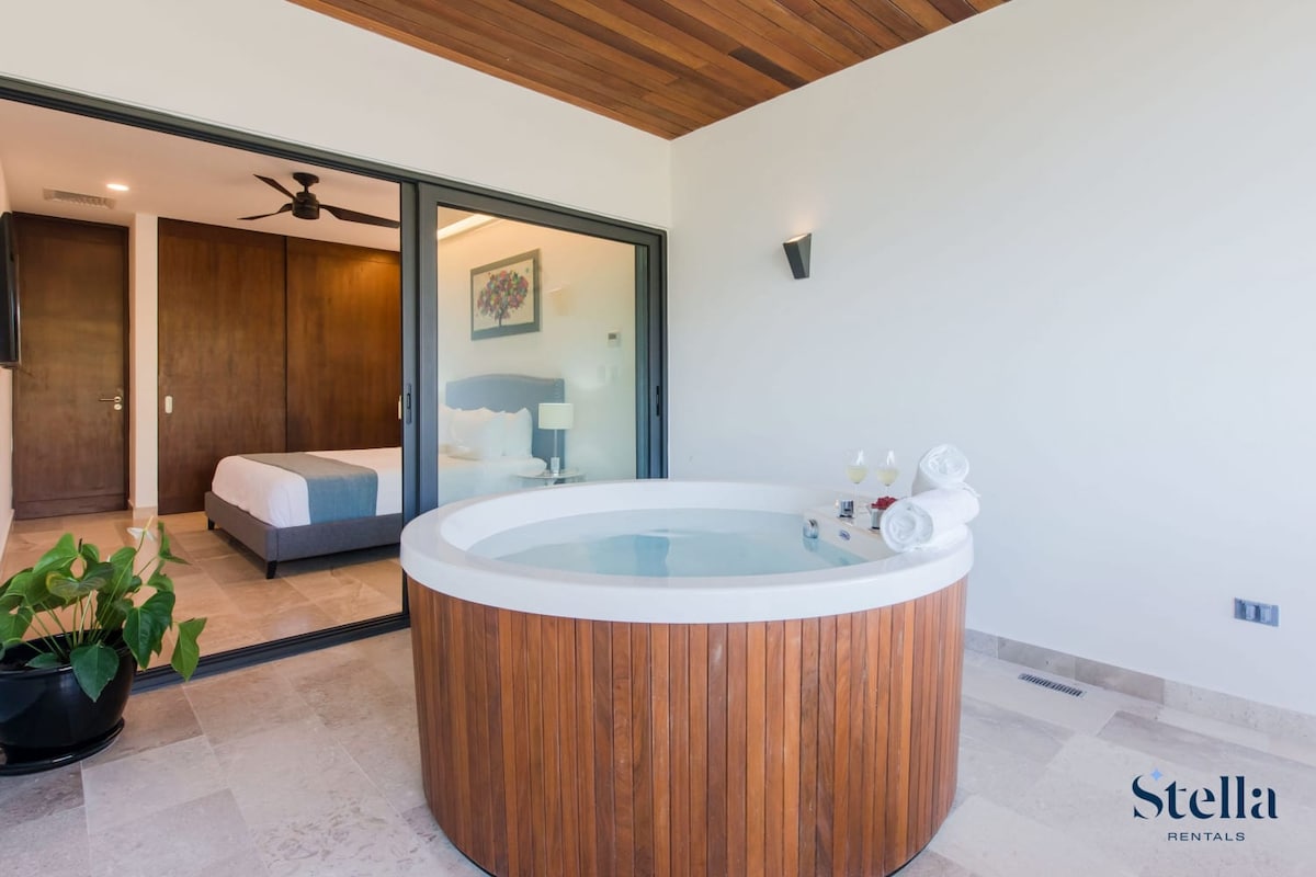 Cool and modern studio , on the roof top floor, in the exclusive hotel zone, besides Hyatt Vivid and Wyndham Alltra. Walk to 5th Av. Incredible view of the sea, fresh breeze, and spectacular terrace with private tub (not heated) overlooking the sea. You would love the place! Studio is ideal for couples Jacuzzi outside is completely private for your enjoyment. Water is not heated, its ambient temp. To access you have to walk stairs (16 steps) to access, its not for people with incapacities