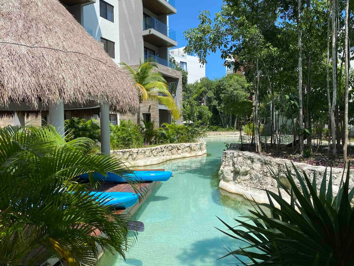 Enjoy a piece of paradise : 120m2 of privacy and relaxation with a beautiful private pool (just for you). A modern, spacious and accommodating full apartment 1 minute from the Caribbean beach, inside the luxury residence of Playacar Fase 1. *King-sized bed *Wi-fi ( good speed to work ) *Full Kitchen *10 min walk from the famous 5th avenue *1 min walk from the beach *Security guard 24/24