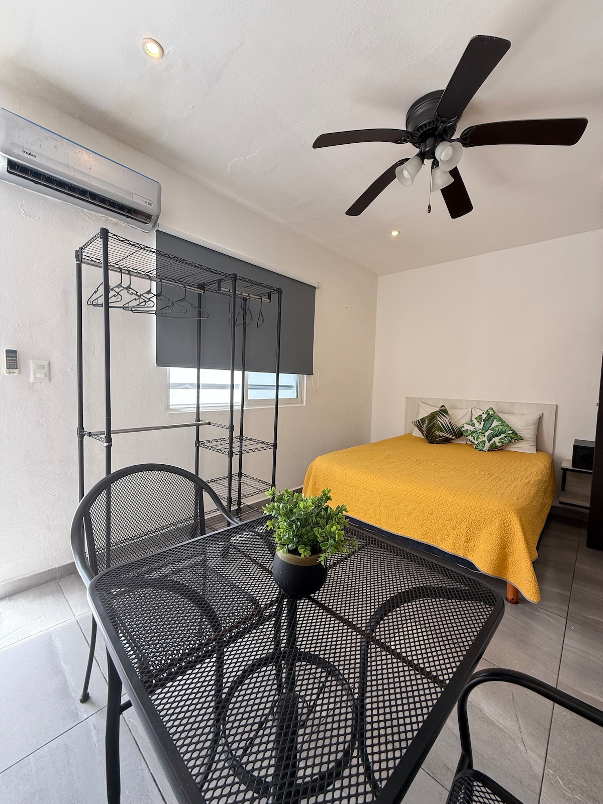 Acogedor estudio ideal para tu estancia en Playa del Carmen. A solo 6 esquinas de la famosa Quinta Avenida y de la playa, y a pasos de tiendas y supermercados. Cuenta con cama Queen, baño completo, clóset amplio, TV con programación, minibar y área de descanso. Incluye estacionamiento dentro de las instalaciones. Perfecto para parejas, viajeros solos o de trabajo que buscan comodidad y ubicación privilegiada