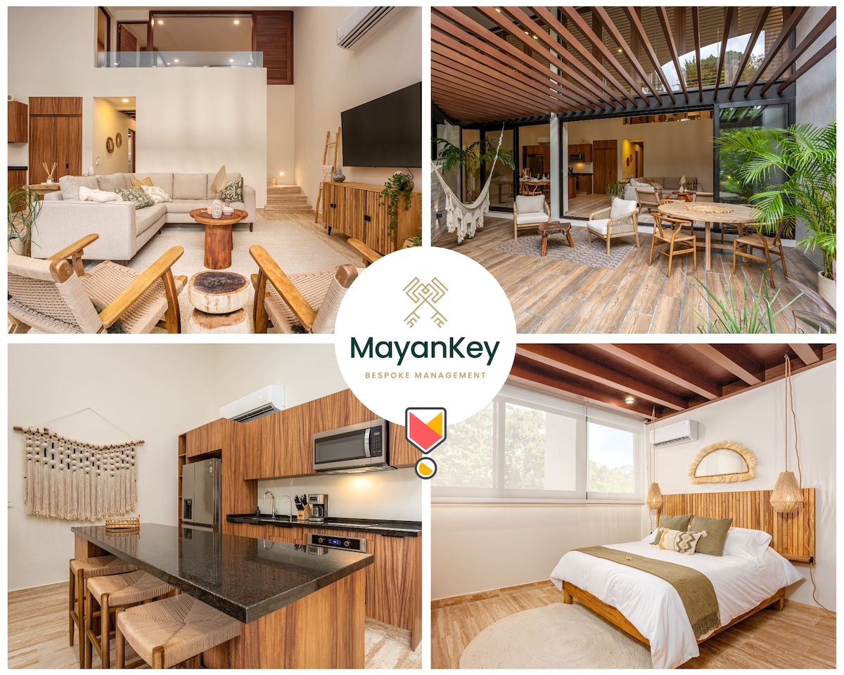 Experience tropical comfort and laid-back luxury with MayanKey at AWA Playacar. This spacious 4BR condo sleeps up to 10 guests, with two king bedrooms on the main floor and two upstairs bedrooms — one with a queen and one with two queens — each with its own full bathroom. Enjoy a private patio with hammock, dining table, and lounge seating, plus access to resort-style amenities including Playa’s largest pool, rooftop lounges, jacuzzis, gym, sauna, coworking space, and more.
