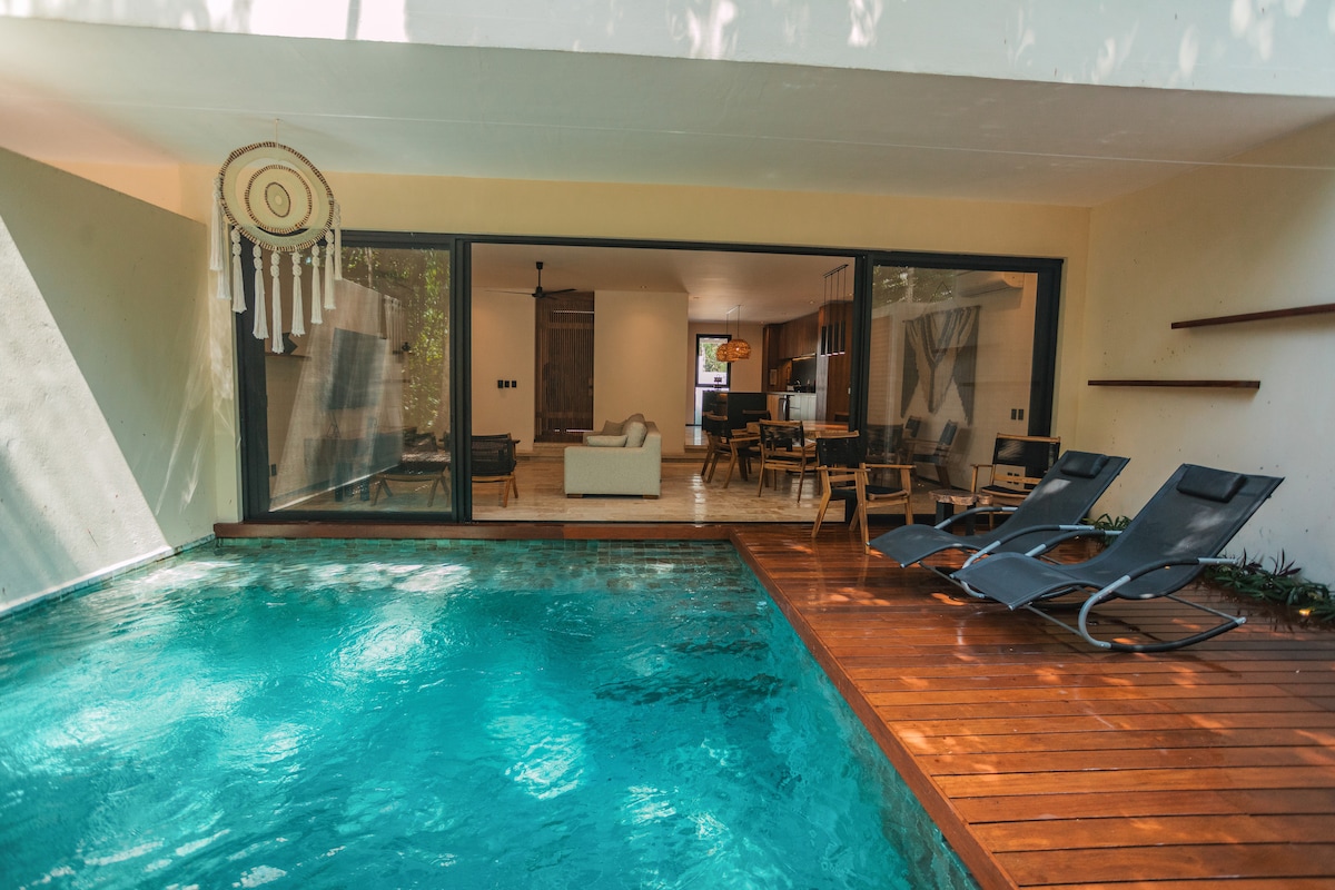 Your own 4000 sqft jungle villa- 5BR, 4BA, 600 sqft private pool, just one house from the sand in exclusive Playacar Fase 1. Rustic charm from 1980 meets big group comfort with 12 beds, lush outdoor space, BBQ, and room to spread out. Walk to ruins, the beach, or 5th Ave. Perfect for family retreats, friend trips, or special events. Not shiny or modernVilla Mayan Breeze has soul. Message us for trusted local referrals—chef, massage, mezcal tastings, and more.