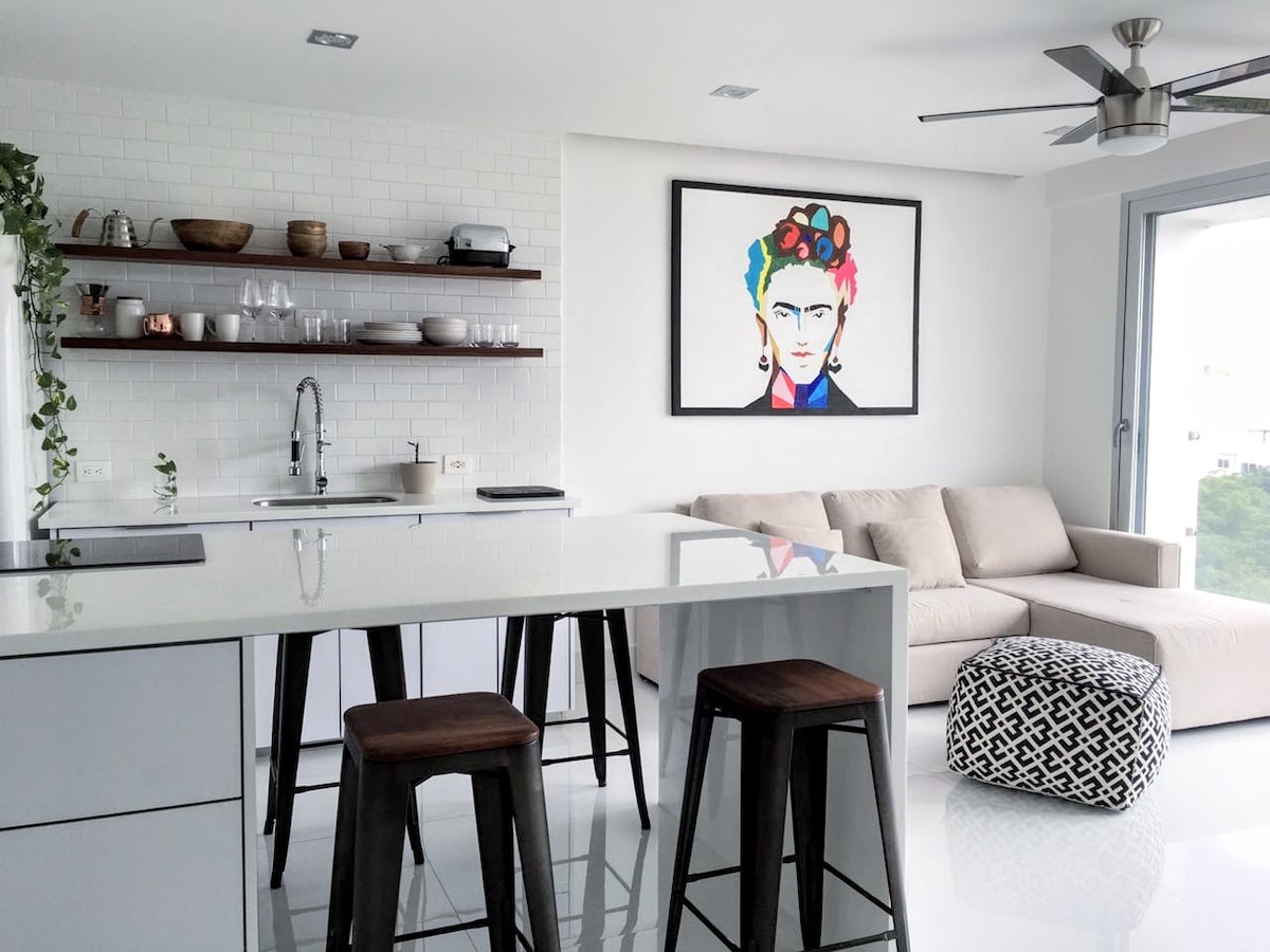 Comfortable apartment for 4 people. In a building specifically designed for tourism. Equipped gym, roof with pool, elevator, green areas, lobby and coworking area with high speed internet. Enjoy Playa del Carmen in one of the quietest areas of the city. In front of the "La Ceiba" cultural park and just 8 minutes from the beach. If what you are looking for is a quiet and well located place in Playa del Carmen, this is the option!