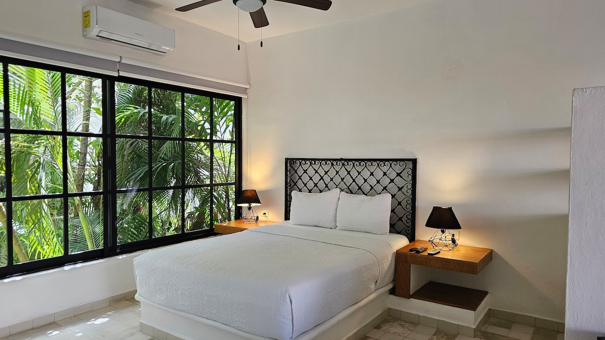 Our home ARKAH, is a one acre jungle oasis with five 2bed/2bath and five 1bed/1bath distancing friendly, 20 minutes from playa del carmen and 20 min from Tulum and only 5 minutes from the spectacular Akumal Beach. Enjoy the cenote shape pool, BBQ grill, sun beds, free parking, strong A/C, fiber optic WiFi (50 Mb/s), fully equipped kitchen. Located on the 2nd floor with lots of natural light and 1 big private terrace.