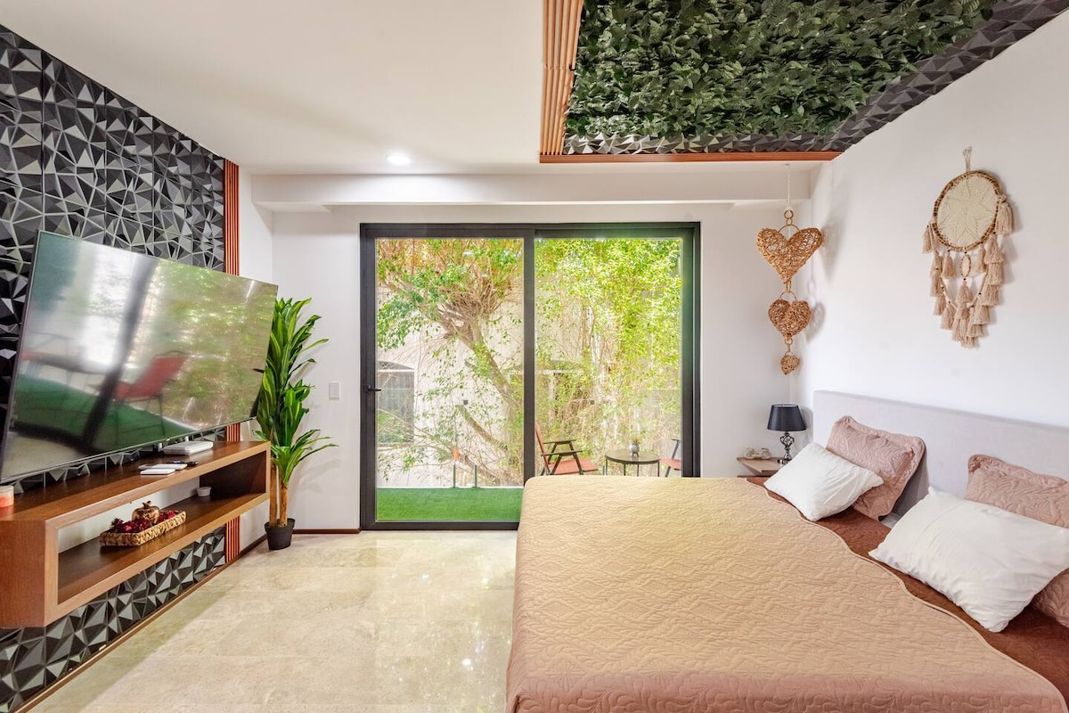 Comfortable apartment for 4 people. In a building specifically designed for tourism. Equipped gym, roof with pool, elevator, green areas, lobby and coworking area with high speed internet. Enjoy Playa del Carmen in one of the quietest areas of the city. In front of the "La Ceiba" cultural park and just 8 minutes from the beach. If what you are looking for is a quiet and well located place in Playa del Carmen, this is the option!